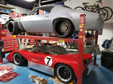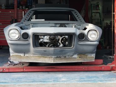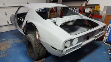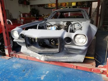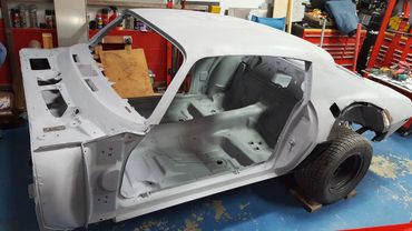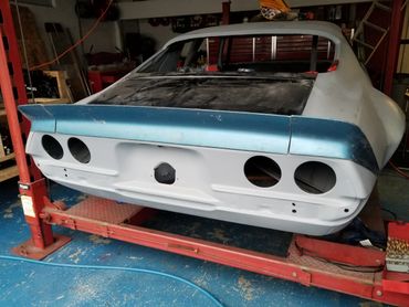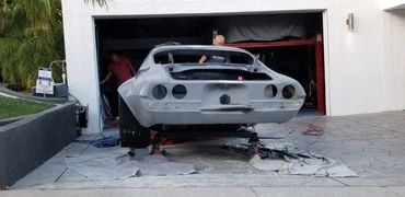 The process includes a complete tear down to the last nut and bolt, placing the body on a rotisserie, and building it back into an International Race of Champions (IROC) style street/race car.